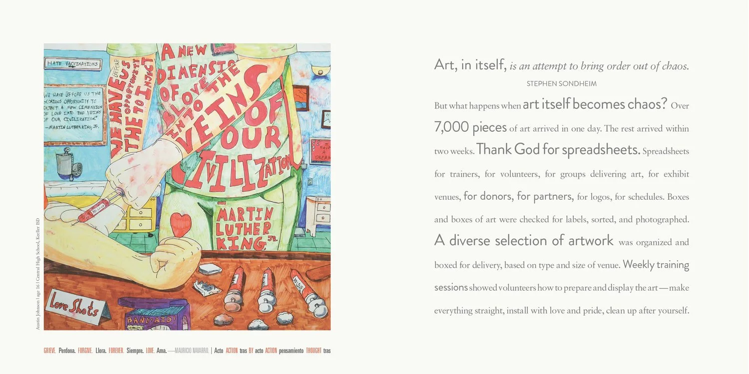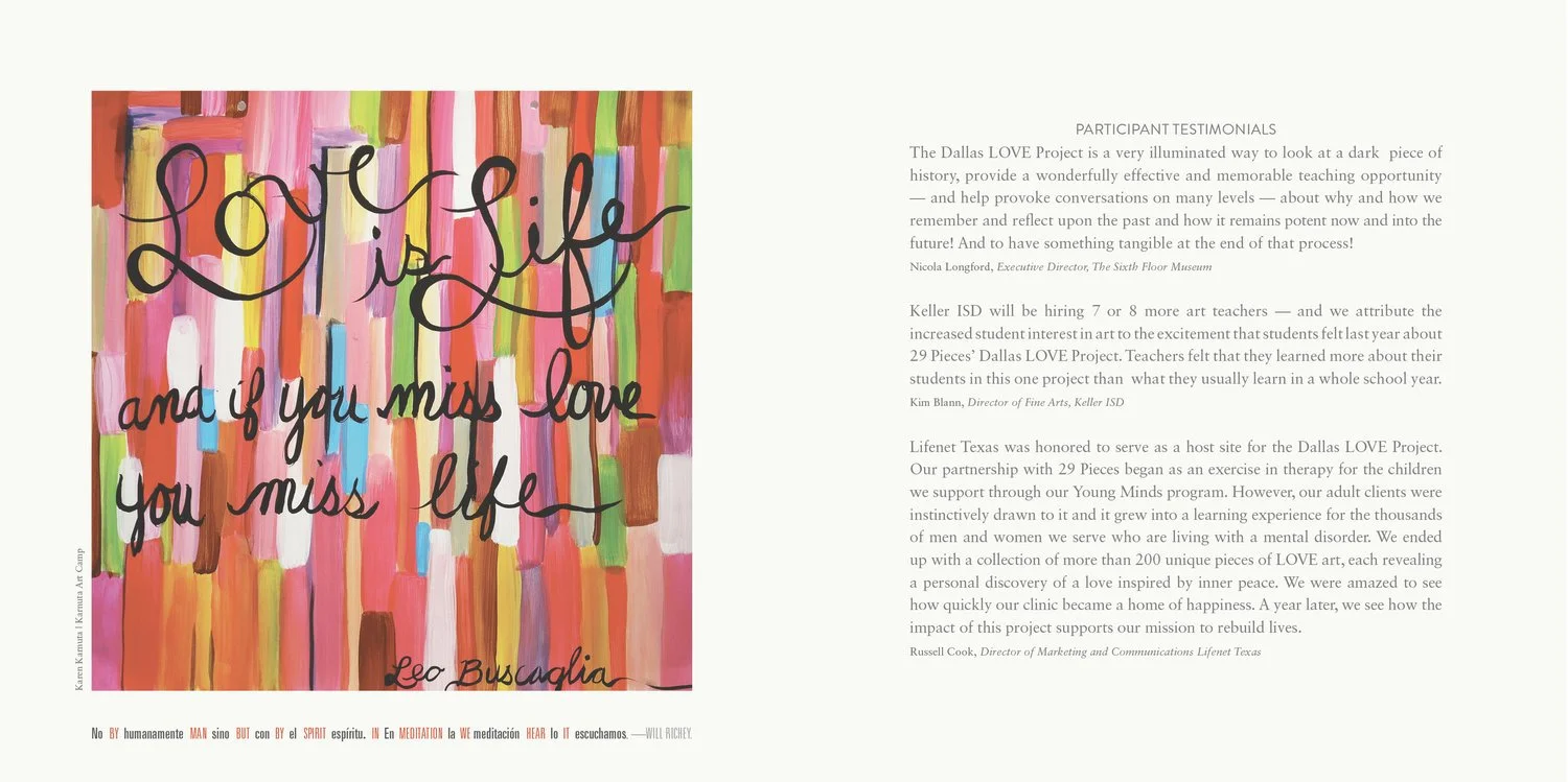 “Why” — 50 years after the assassination of President Kennedy did the people of Dallas, Texas create 10,000 pieces of art? They did so, to surround Dallas in an unconditional chain of love. A much needed belated response to being labeled the “City of Hate” in 1963. From this landmark project, 29pieces.org produced The Dallas Love Project book. In turn inviting Cliff Simms and Peter Wood of Resident Alien to concept and design this — one foot square of love. Along with a short film below, that announced its release.