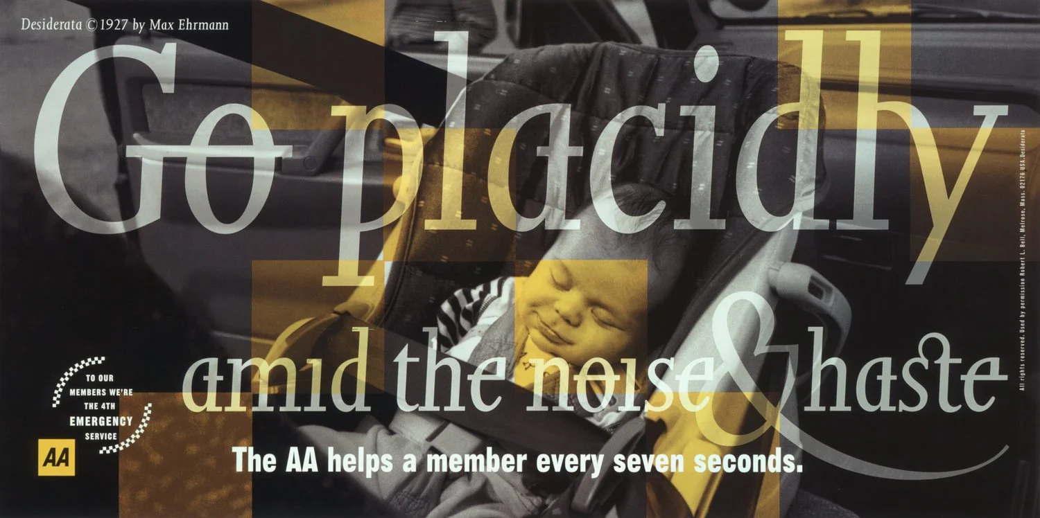 This billboard went up in major cities in the UK to remind people to be calmly assertive, respectful of others and non-confrontational. And should their car break down? Then the AA was there, to help its members restart their lives and cars. Peter designed the campaign, including its unique typographic look. Inspirational words from “Desiderata” by Max Ehrmann.